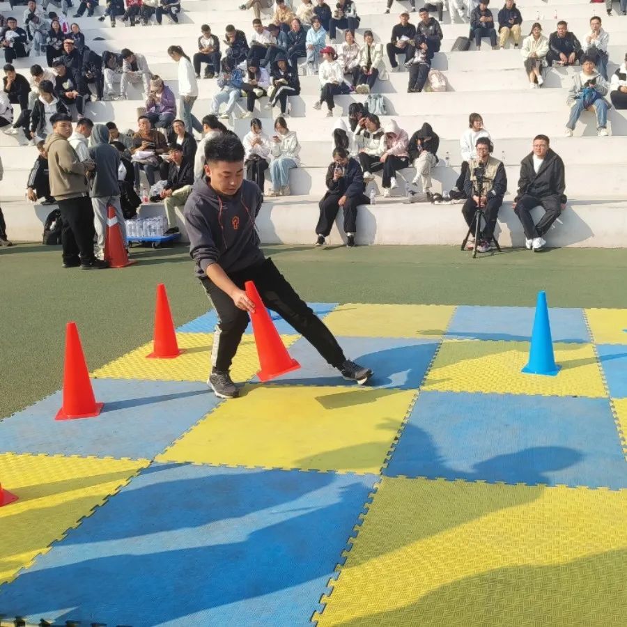 两队相对24米距离共用一块16格图形,图形分别距离两队10米远。两队各持一种颜色标志物,背对起点站立,听到指令后,每名运动员将标志物放入16格图形任意一格中,返回起点触碰下一名运动员背部后完成接力,依次进行,直至将同种颜色的四个标志物放在方格中连成直线或斜线,即为获胜。