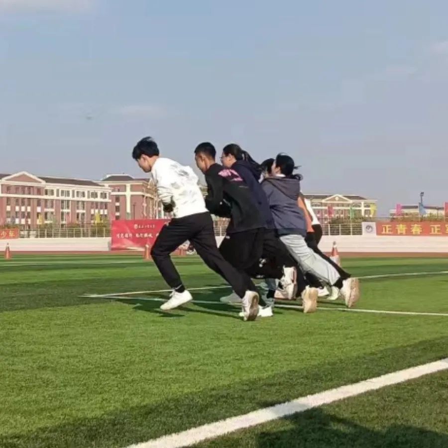 每队4人成一路纵队站在足球场中圈上,在每两人胸背部之间夹住瑜伽球,双臂与地面平行张开,听到指令后,按指定路线进行追逐,接触到对方任何身体部位即为获胜。
