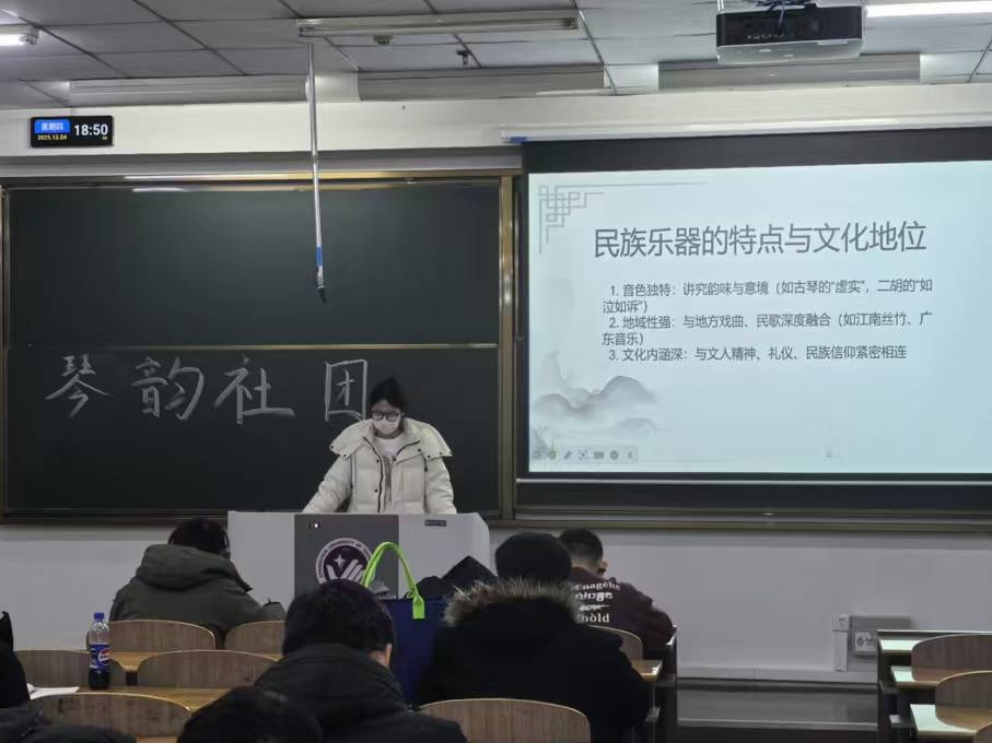 活动伊始,李曼洲同学为大家进行弦类乐器科普。通过图文结合的方式,生动讲解了钢琴,古筝等经典琴类的历史渊源与文化内涵。从古琴的 “高山流水遇知音” 典故,到古筝的地域流派演变,再到钢琴的西方古典音乐脉络,细致的讲解让同学们对不同琴类的发展历程有了系统认知。