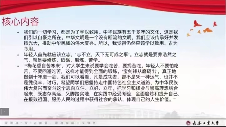 本次会议通过PPT讲解和观看新闻视频等多种形式相结合,向我们生动讲述了《习近平与大学生朋友们》专题活动的主要核心内容,深入学习贯彻习近平新时代中国特色社会主义思想。此外,通过观看《新时代的中国青年》白皮书相关新闻报道,我们更加深刻全面地感受到它以宏阔的视野,将新时代的中国青年事业置于一百多年来中国人民和中华民族谋求复兴的伟大历史进程中,从而增添了深厚的历史底蕴。在总结当代青年工作成就与经验的基础上,不忘本来,面向未来,提出了对青年的殷殷希望。