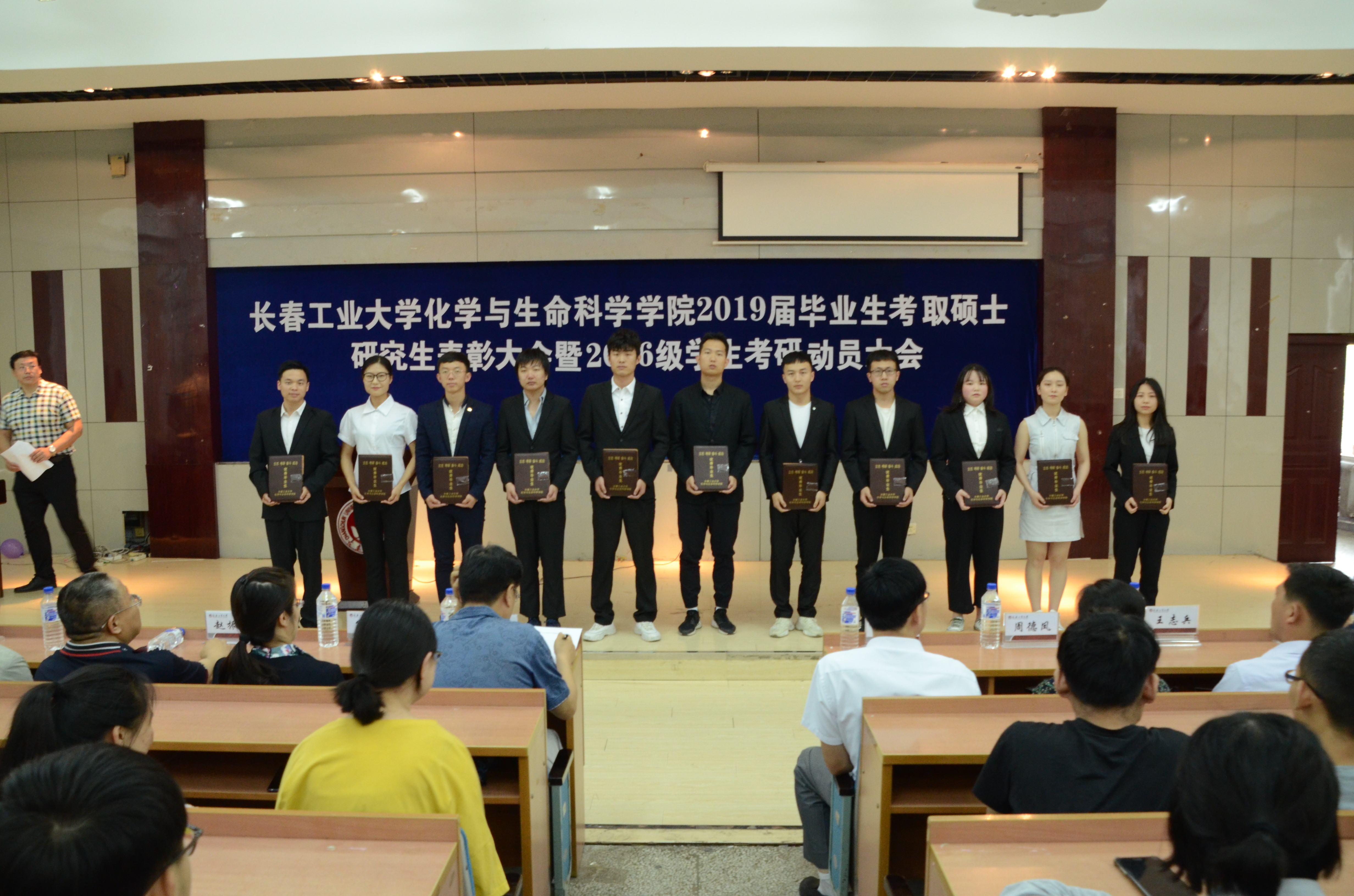 化学有生命科学学院关于表彰2019届毕业生考取硕士研究生的决定》。与会领导为受表彰学生颁奖,丁鹏等5名优秀毕业生代表分享了考研经验。