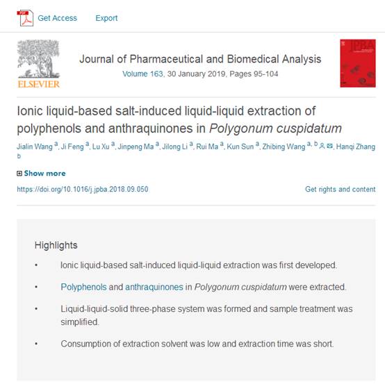 是药物分析领域重要的国际期刊之一,2017-2018年影响因子为2.831,属于医学大类3区,分析化学2区,药学2区。该研究基于高效、环保的理念,提出一种新的绿色、简单、微型化的样品前处理技术,即基于离子液体的盐诱导液-液-固萃取体系,用于中药材虎杖中多酚和蒽醌类化合物的分离分析,该法解决了以往研究方法中分离时间长以及消耗大量有机溶剂造成环境污染的问题。