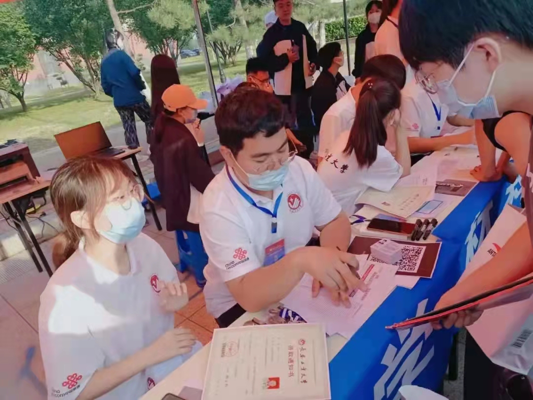 辅导员张鹏老师亲临现场,统一指挥协调迎新工作,与报到的学生及家长们攀谈,耐心的对新生报到中的疑问进行讲解。勉励新生入学后发愤图强,回报社会。