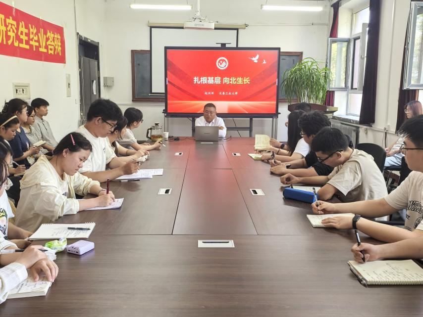 的学生在基层工作中具备显著优势。最后,赵洲洋为同学们推荐了《先生向北》一书,讲述了老一代知识分子的故事,鼓励当代青年继承这种精神,扎根东北,为振兴贡献力量。