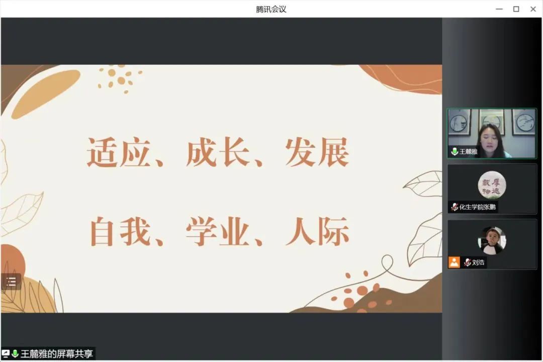 会议上,王麓雅老师主要强调四个方面内容。一是自我适应。王麓雅老师指出大一新生们正处于自我同一性形成的关键时期,因此需要同学们正确认识自我,立足现实,找到自我在现实社会中最恰当的位置,充分实现自己的人生价值。二是学习适应。王麓雅老师建议大一新生要尽快确立人生目标,在丰富的校园文化生活中锻炼综合素质。三是人际适应。王麓雅老师指出大学是一个全新的生活环境,只有学会尊重,共情,真诚,赞美,才能建立良好的人际关系。最后王老师表示如果新生有任何问题都可以进行心理咨询,并且鼓励新生放平心态,稳扎稳打,用心钻研,勇攀高峰。