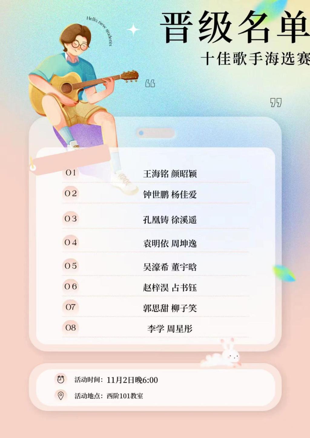 让我们恭喜以上选手的出色发挥,希望他们能够在新一轮的比赛中,唱出更亮眼的表现,同时也要对所有积极参加海选的同学说,青春的舞台绚丽多彩,勇于登台演唱就是最闪亮的底色!