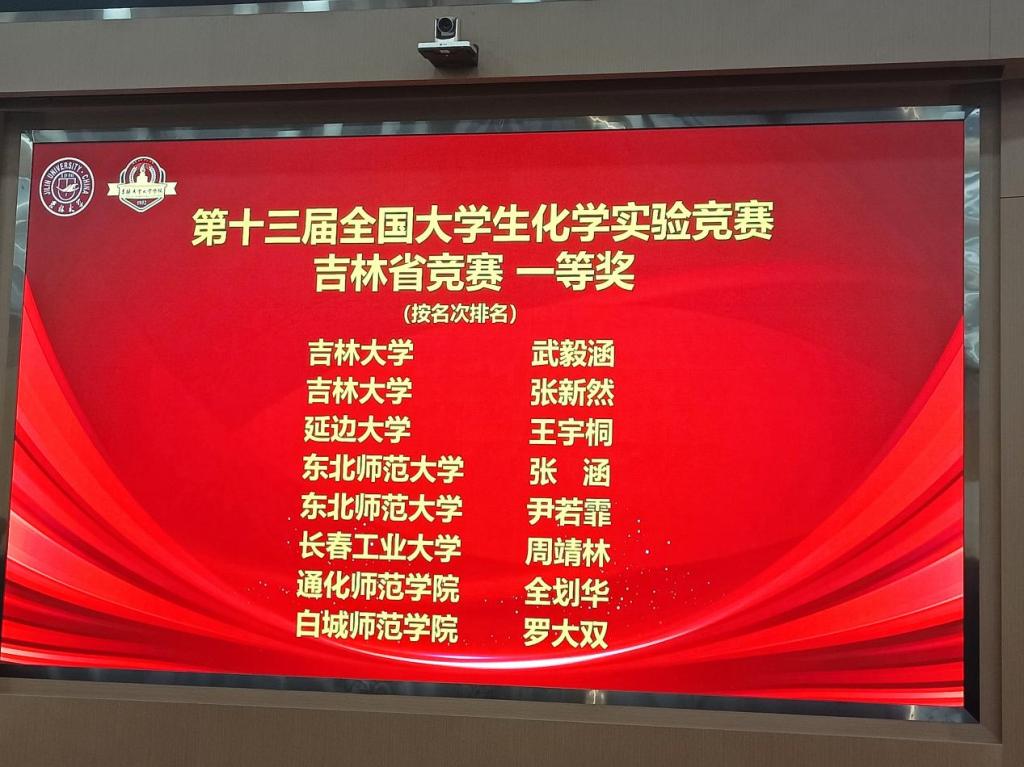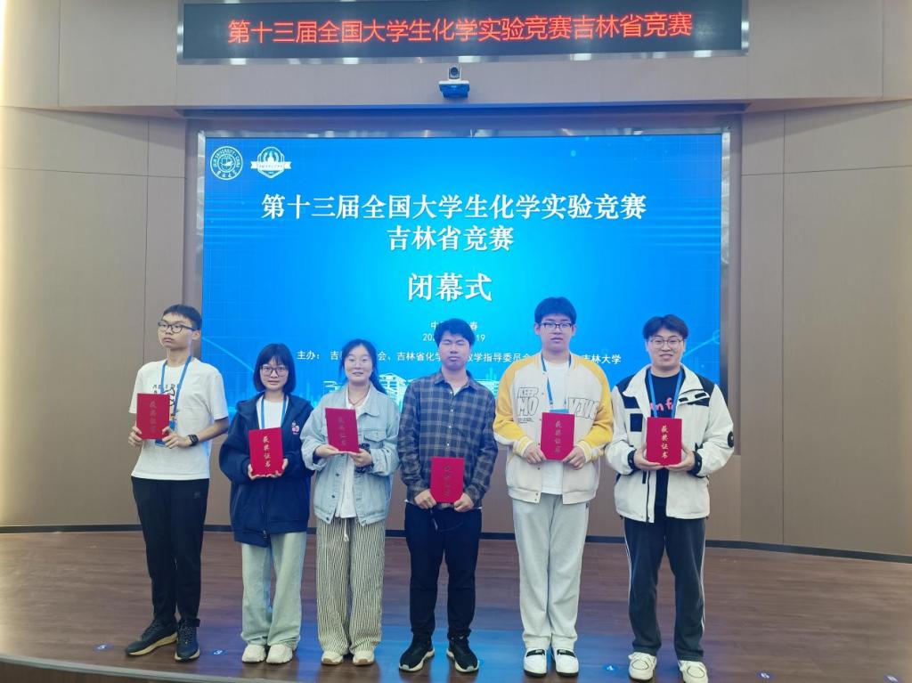 6名同学参加比赛,全部获奖,成绩优异。其中,22级周靖林同学获得一等奖,22级李威萱,韩旭荣,张伟益,梁郝四名同学获得二等奖,21级崔佳雪同学获得三等奖。获得一等奖的周靖林同学将代表吉林省参加第十三届全国大学生化学实验竞赛(省赛选拔5名同学参加国赛)。