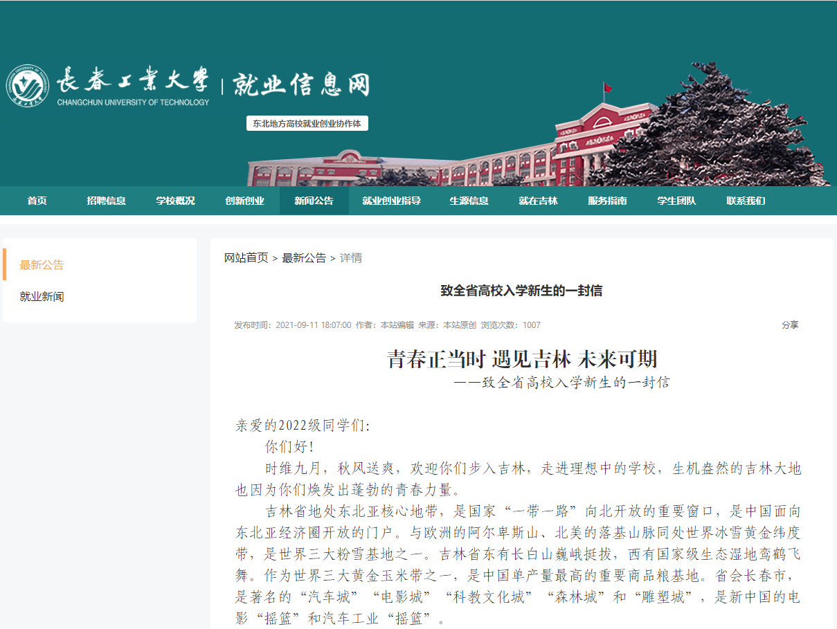 致全体新生家长的一封信》,以深情的笔触,表达了对同学们在吉林大地一展身手、建功立业、实现梦想,书写无悔青春的殷切期望,如暖流入心,似春风拂面,极大地激发了同学们留省就业创业的热情。大家纷纷表示,两封信的内容句句饱含深意,字字充满期望,阅读以后备感振奋,更加明晰了成长方向,在接下来的大学生活中,将珍惜宝贵年华、树立报国之志、练就实干之功,成为吉林全面振兴全方位振兴的生力军。