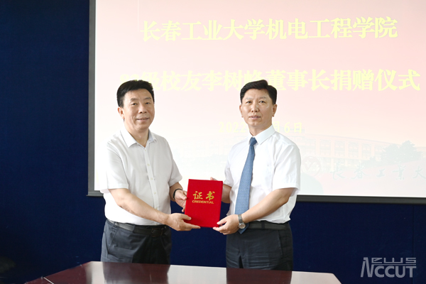 张明耀代表学校与李树峰校友签订捐赠协议,并接受30万元捐赠资金。孙长智向李树峰校友颁发了捐赠证书。